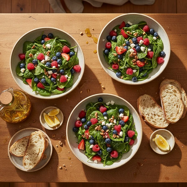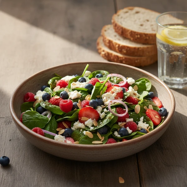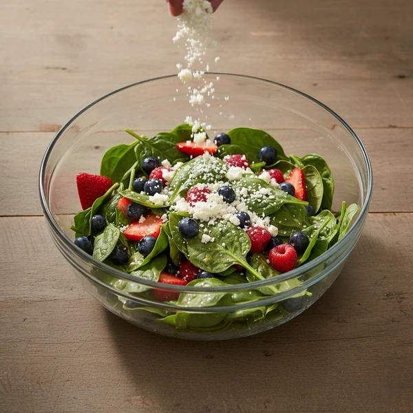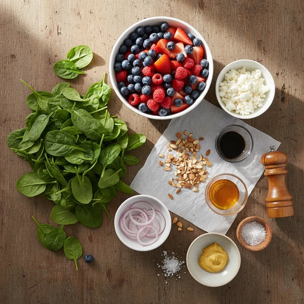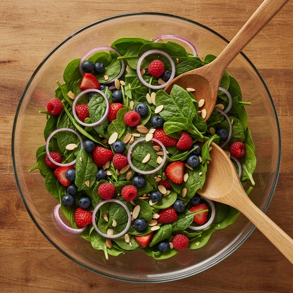 In your large salad bowl, create a lush bed of 6 cups baby spinach as foundation. Scatter 1 cup mixed berries artfully across surface, nestling larger strawberry slices among smaller blueberries/raspberries. Add optional thinly sliced red onion in small pinches for color pops, then sprinkle cooled toasted almonds evenly—hold back 1 tablespoon for final garnish to maintain crunch through serving.