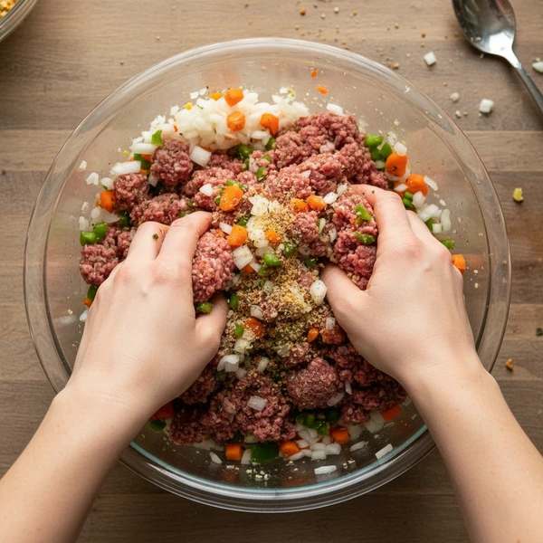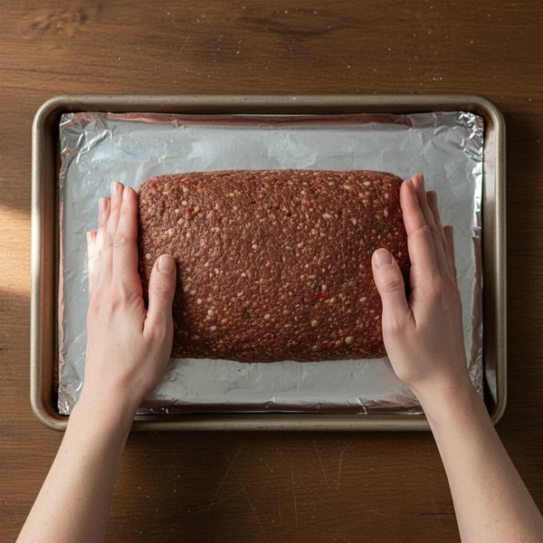 Transfer mixture to prepared pan, pressing gently into corners OR mound into 9×5-inch loaf on sheet with 2-inch height max and tapered ends. Smooth top with wet hands/spatula, create 1/4-inch center dome for fat runoff. Loaf pan yields moist slices; free-form gives crispy edges—both bake identically.