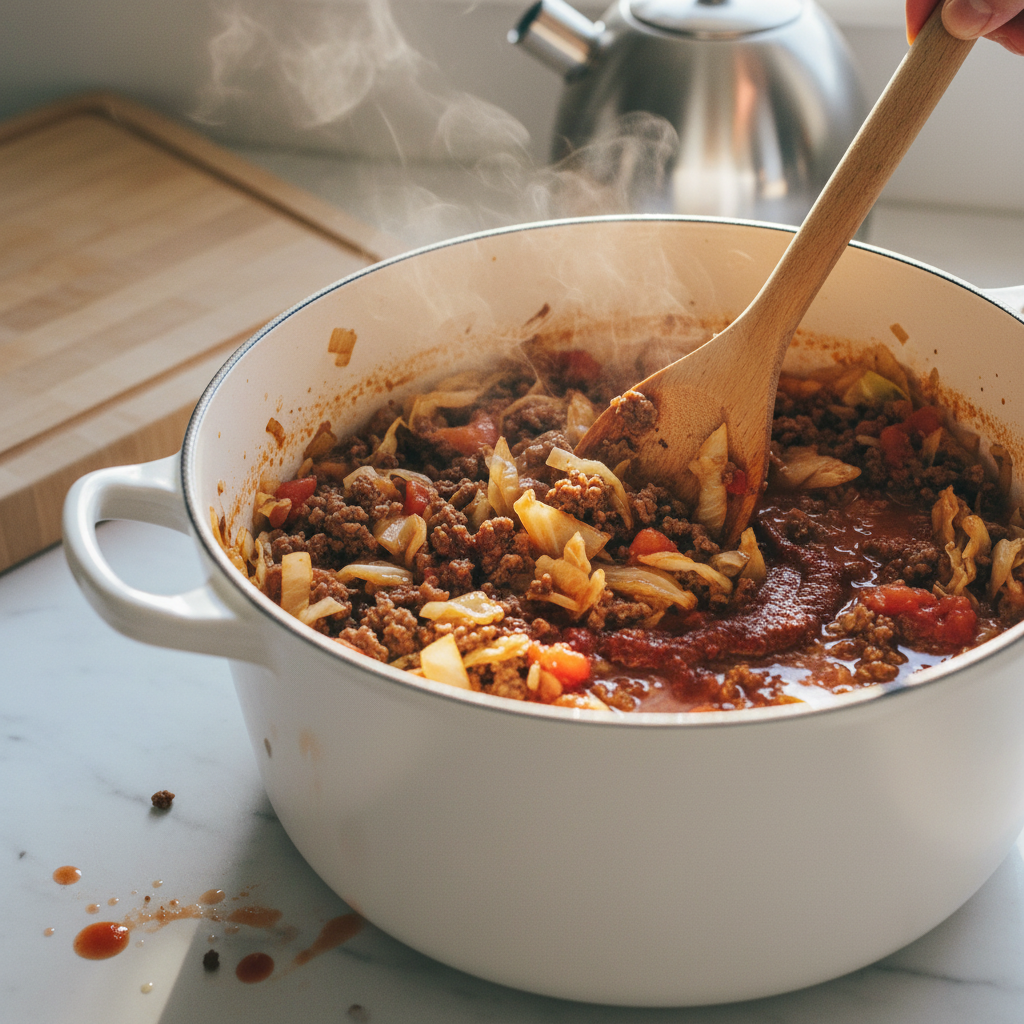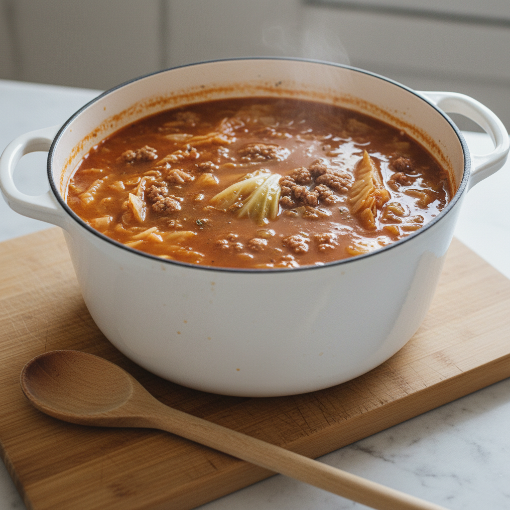 Pour the beef broth into the pot and bring the mixture to a gentle boil. Once boiling, reduce the heat to maintain a steady simmer and let the soup cook uncovered for about 20-25 minutes. This simmering time is essential for allowing the flavors to meld while the cabbage softens to the perfect tender-but-not-mushy texture. During this period, the soup will develop that rich, complex flavor profile that makes golumpki soup so satisfying. You’ll notice the broth taking on a beautiful reddish-brown color as it reduces slightly and concentrates in flavor. Stir occasionally to prevent anything from sticking to the bottom of the pot and to help distribute the heat evenly.