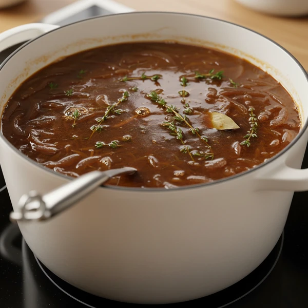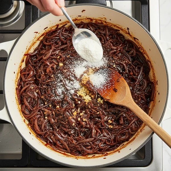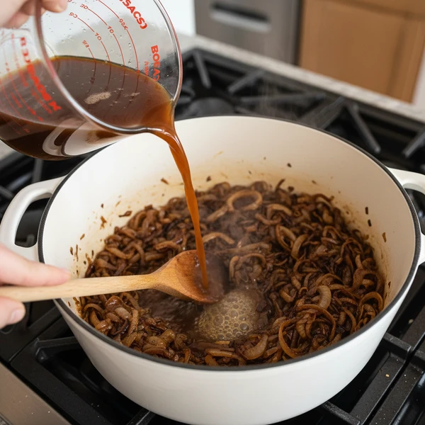 Pour in ½ cup beef stock (or beef stock mixed with a little vinegar), scraping the bottom of the pot with your spoon to loosen all the browned bits. Let it simmer for 2–3 minutes until slightly reduced and the fond is dissolved into the onions.