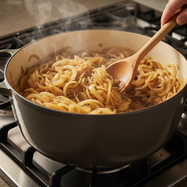 This stage typically takes 35–45 minutes, depending on your pot and stove. If brown bits begin to form on the bottom before the onions deepen in color, add a tablespoon of water and scrape with the wooden spoon to dissolve them back into the onions.