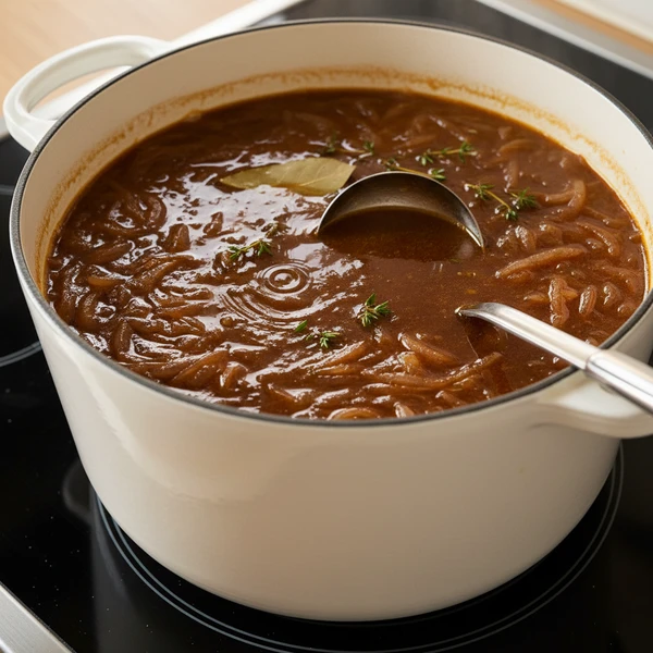 Sprinkle flour over the onions and cook for 1–2 minutes, stirring constantly. This lightly toasts the flour and helps thicken the broth so it has that velvety restaurant texture instead of feeling watery.