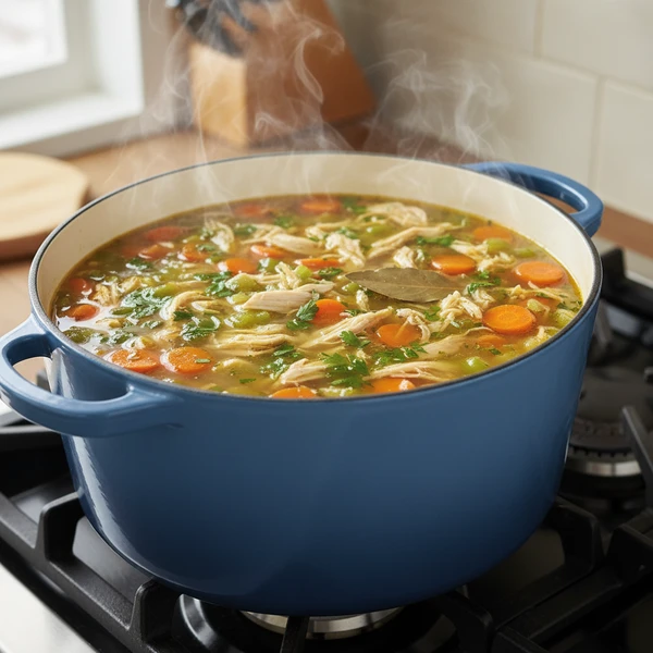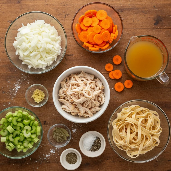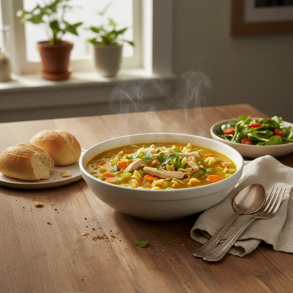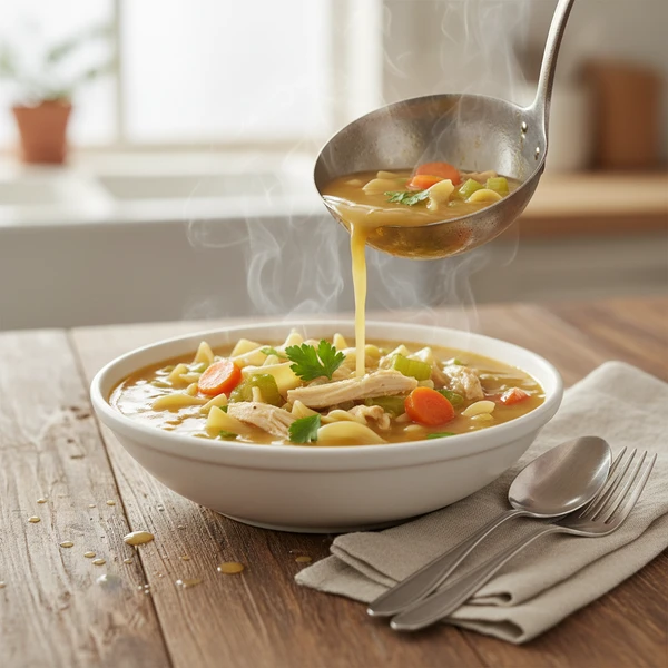 Vegetables cook first to build sweet-savory foundation through natural sugars and Maillard browning, while low-sodium stock + progressive seasoning creates perfectly balanced broth without saltiness. Shredded rotisserie chicken adds instant richness from rendered fat without cloudy broth from raw bones. Egg noodles added last-minute absorb just enough starch for silky texture without over-thickening—fresh lemon/herbs finish brightens all flavors without overpowering classic comfort profile.