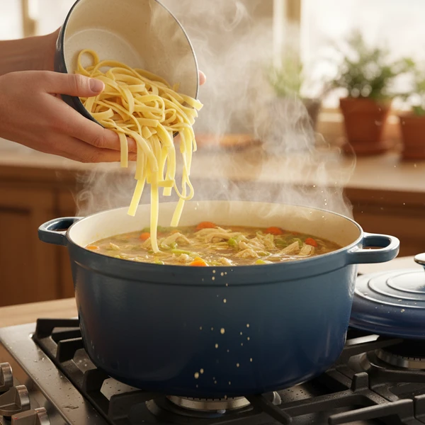 Increase heat to medium, bring back to gentle boil (steady bubbles). Scatter 2 cups egg noodles evenly, stir immediately + thoroughly to prevent clumping/sticking to bottom. Cook uncovered 6-8 minutes (package time minus 1 min for al dente)—stir every 2 minutes, taste noodle at 6 min (tender but firm center). Noodles thicken broth slightly via starch release—perfect consistency ladles easily. Don’t overcook (mushy ruins texture).