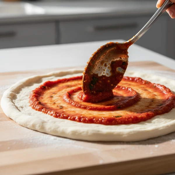 With your dough perfectly shaped and oven preheating, spoon about 1/2 cup of crushed San Marzano tomatoes or quality tomato sauce into the center of the dough. Using the back of the spoon or your fingers, spread it evenly in a thin, uniform layer across the surface, leaving a clean 1-inch border around the edges to allow the crust to rise beautifully without sogginess. Work gently to avoid tearing the dough, aiming for just enough sauce to provide bright acidity and moisture without overwhelming the other ingredients. Finish by sprinkling a tiny pinch of salt evenly over the sauce—this simple seasoning enhances the tomatoes’ natural sweetness and ties the flavors together from the very first layer.