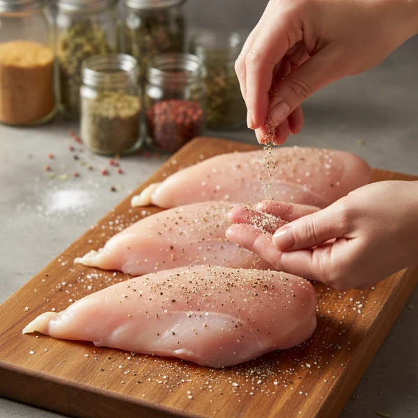 Pat chicken cutlets completely dry with paper towels—moisture prevents crisp breading. Place between plastic wrap or parchment, pound gently with meat mallet flat side to uniform 1/4-inch thickness (thinner edges ok). Season both sides evenly with 1/2 tsp kosher salt, 1/4 tsp pepper, pinch garlic powder. Let sit 5 minutes for seasoning penetration while setting up station.