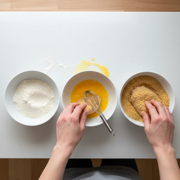 Arrange 3 shallow bowls in row: #1 whisked flour + salt/pepper/garlic powder; #2 beaten eggs + water + salt; #3 panko + grated Parmesan + garlic powder + Italian seasoning. Dredge each cutlet in flour (shake excess), dip fully in egg wash (let excess drip), press firmly into crumbs turning to coat completely—use dry hand for flour/crumbs, wet hand for egg. Place breaded pieces on wire rack; repeat immediately for even fresh coating.