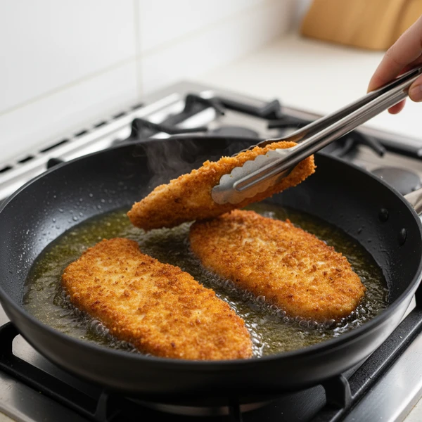 Heat 1/4-inch neutral oil in 12-inch skillet over medium-high until shimmering (350-375°F—sprinkle panko tests ripple). Fry breaded cutlets in batches (don’t crowd), 3-4 minutes per side until deep golden brown—adjust heat to medium if browning too fast. Drain on paper towel-lined rack; repeat adding oil as needed. Chicken should reach 160°F internally post-fry.