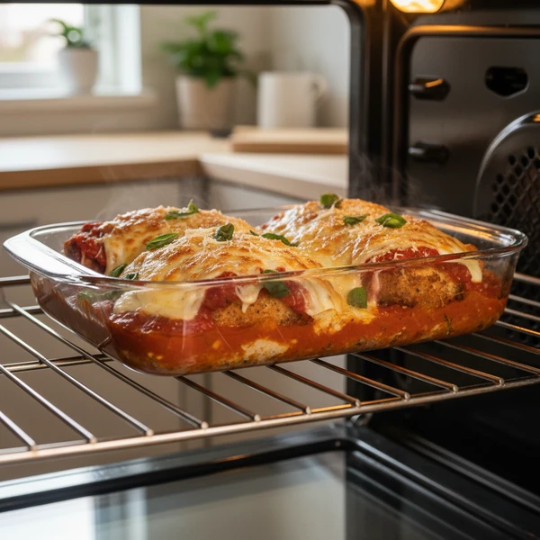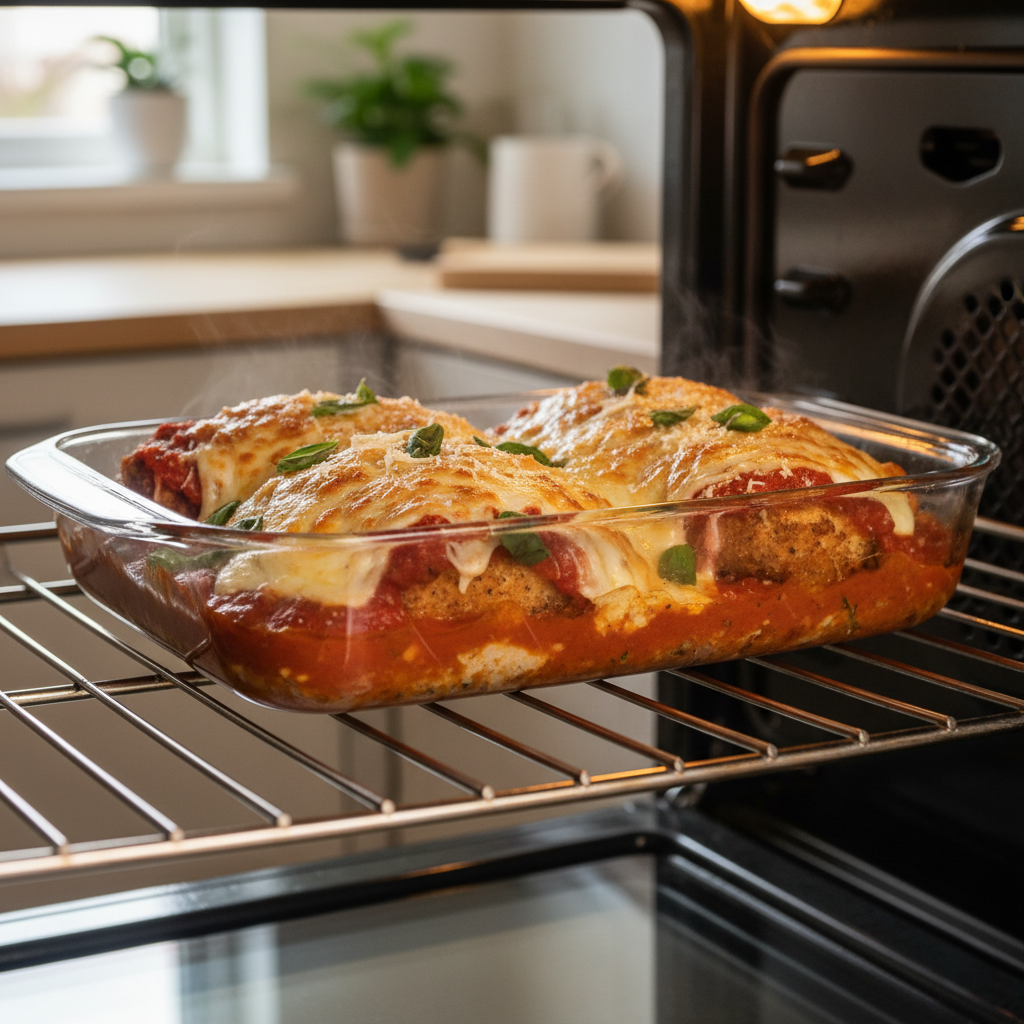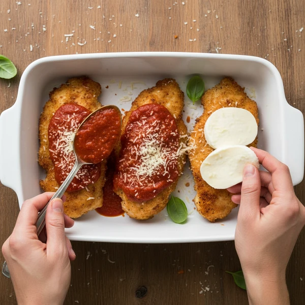 Preheat oven to 375°F. Lightly oil 8×8 or 9×13 baking dish. Arrange fried cutlets in single layer. Spoon 1/4-1/3 cup warmed marinara over each (avoid edges for crisp retention). Top generously with shredded/sliced low-moisture mozzarella + sprinkle Parmesan. Sauce stays light to preserve crunch.