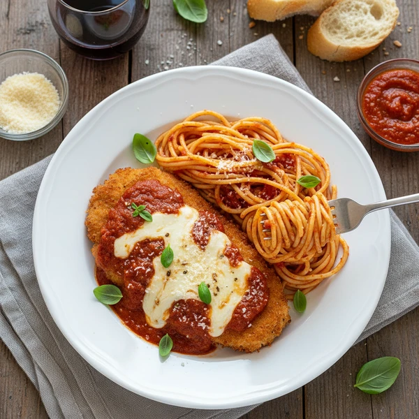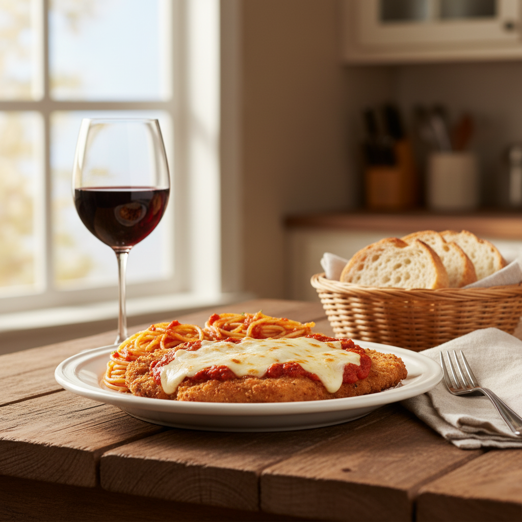 Pair with lightly sauced spaghetti/bucatini, crisp Caesar salad, garlic bread, or roasted broccoli/asparagus. Keep extra marinara separate so diners control sauciness while preserving signature crunch. ~550-650 kcal per cutlet without sides; varies by breading/oil absorption.