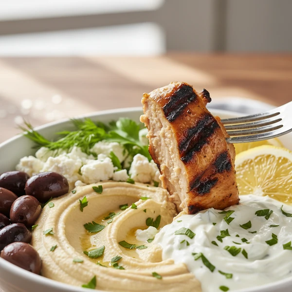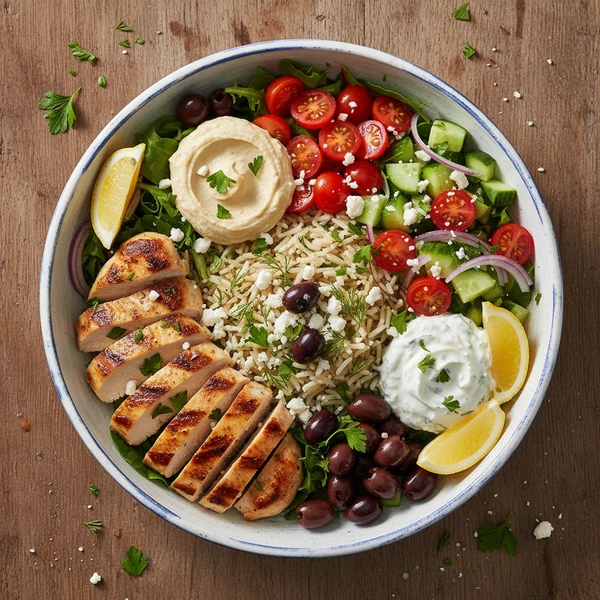 In wide shallow serving bowls, create warm grain base (1/4-1/3 cup per bowl). Arrange sliced chicken attractively fanned across grains. Mound vibrant salad mixture to one side for color contrast. Position generous dollops of hummus and tzatziki opposite each other. Scatter feta crumbles, olive halves artfully around perimeter. Finish with lemon wedge, drizzle reserved marinade or olive oil, and sprinkle fresh herbs. The strategic arrangement maximizes flavor progression from comforting grains→juicy protein→crisp veggies→creamy dips in every perfect bite.