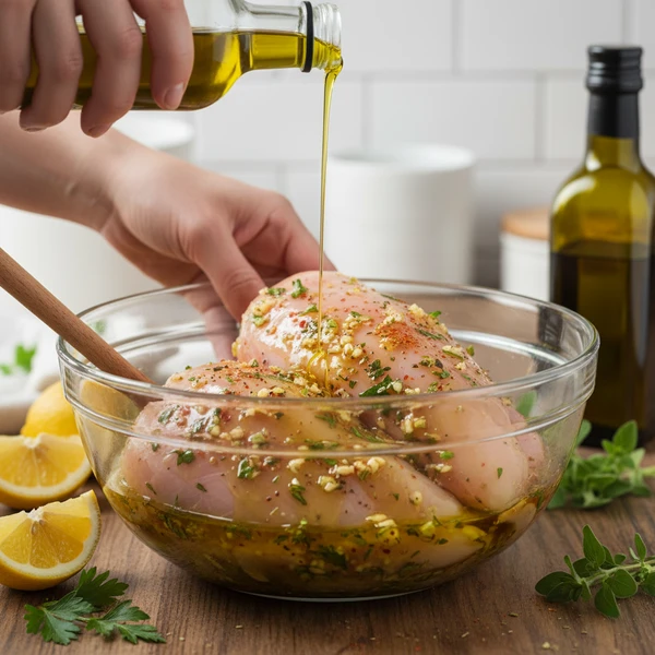 In a medium glass or ceramic bowl, whisk together 3 tablespoons olive oil, juice and zest from 1 lemon, 3 minced garlic cloves, 1 tsp oregano, 1 tsp cumin, 1 tsp kosher salt, and 1/2 tsp black pepper until emulsified. Add 1 lb chicken breast (pounded to even thickness) and use tongs to thoroughly coat every surface. Cover tightly and marinate at room temperature 30-60 minutes or refrigerate up to 24 hours—the acid tenderizes while spices penetrate deeply for restaurant-quality flavor in every juicy bite.