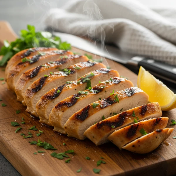 Preheat grill pan, cast-iron skillet, or outdoor grill to medium-high (about 400°F surface temp). Remove chicken from marinade (reserve liquid), pat lightly dry, and add to hot surface. Cook undisturbed 5-6 minutes until deep golden crust forms and chicken releases easily. Flip carefully with tongs and cook additional 4-6 minutes until internal temperature reaches 165°F. Transfer to clean cutting board, tent loosely with foil, and rest 5 minutes. Slice against grain into 1/4-inch thick pieces for maximum tenderness and sauce absorption.