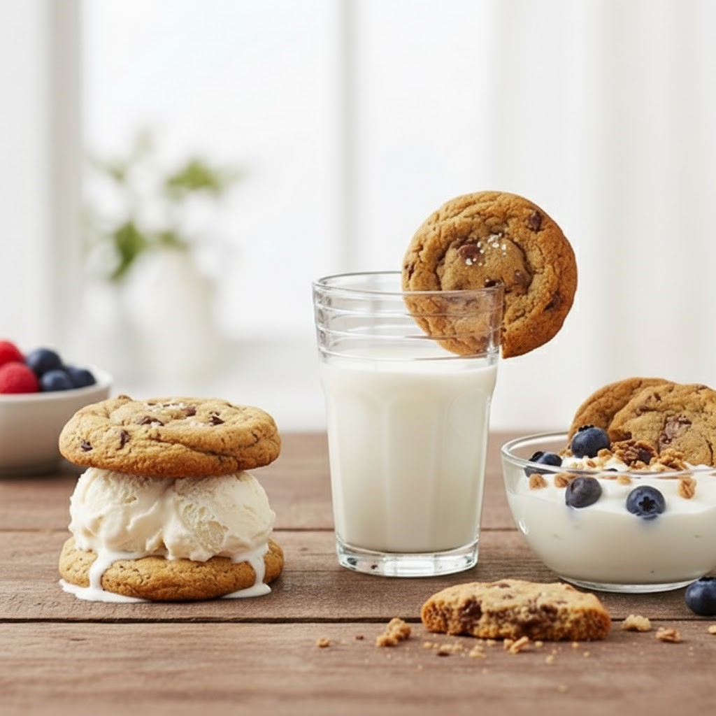 - Cold milk (classic), hot coffee, or vanilla ice cream sandwiches.