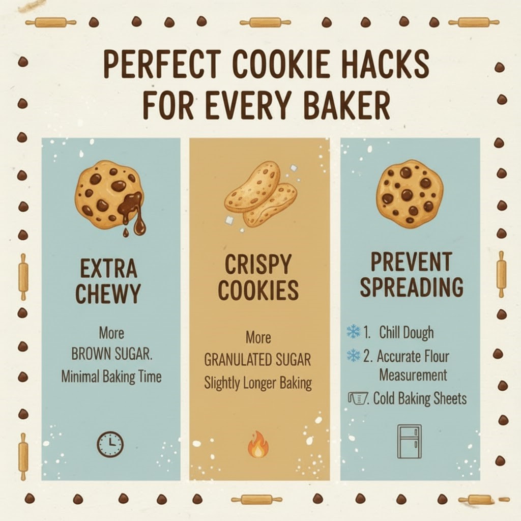 - No-spread fix: Always chill, spoon/fluff flour (don’t pack), use cold/weighed sheets.