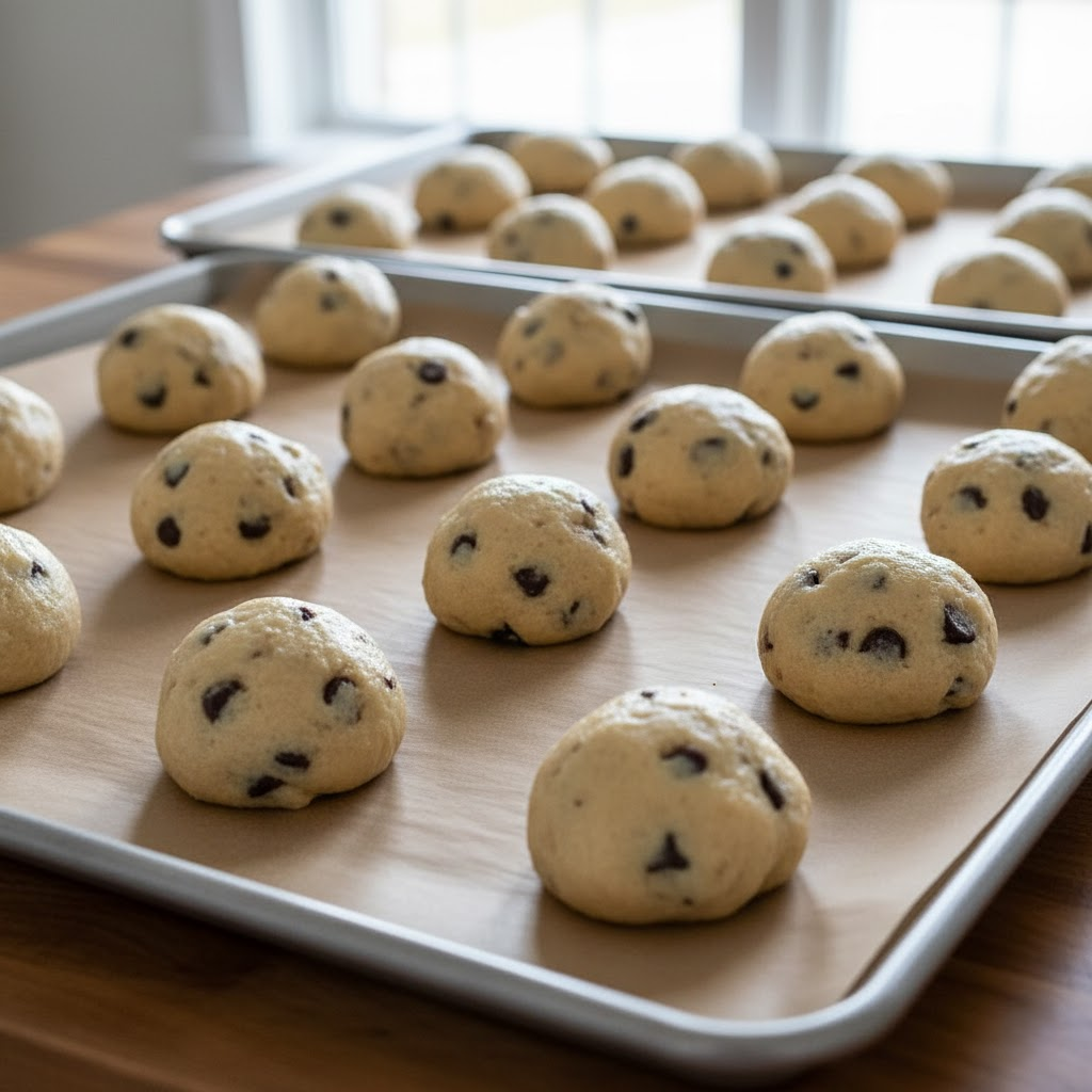 Scoop 2-tbsp dough balls onto parchment-lined sheet (makes ~24). Press extra chips on top for beauty. Cover loosely, chill minimum 30 minutes (ideally 2 hours/overnight)—chilling firms butter, controls spread, concentrates flavor, prevents greasy cookies. Freeze option: up to 3 months in freezer bag.