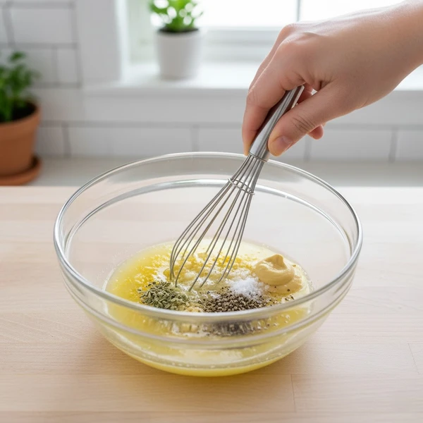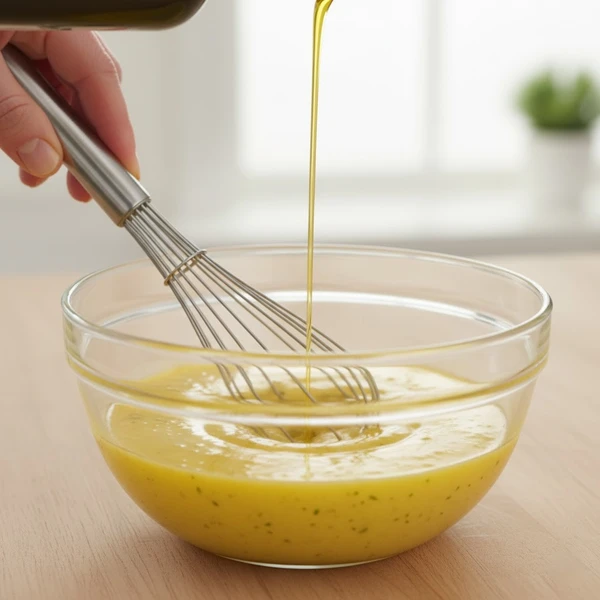 - Gradually drizzle in extra virgin olive oil while continuously whisking to form a smooth, well-emulsified vinaigrette that melds bright citrus with rich, peppery oil.