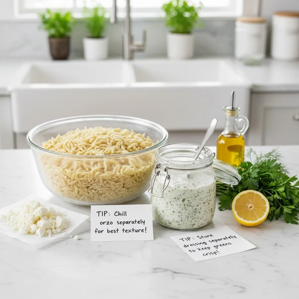 Chill the cooked orzo and vinaigrette separately for up to 24 hours to preserve freshness. Combine them about an hour before serving to allow flavors to meld beautifully. Add delicate ingredients like feta and fresh herbs just before serving to keep their textures intact. Leftovers can be stored in airtight containers for up to 3 days, and refreshed with a splash of lemon juice or olive oil to revive flavor.