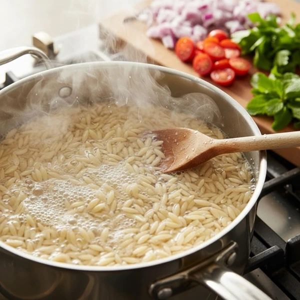 - Bring a large pot of water to a boil, adding a generous pinch of salt to enhance pasta flavor. Add the orzo pasta and cook for 7 to 8 minutes until the texture is tender but still retains a slight bite (“al dente”).