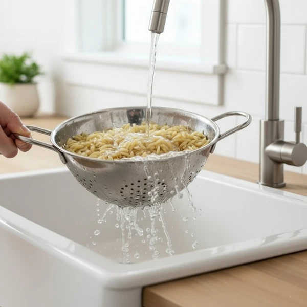 - Immediately drain the pasta in a colander and rinse it under cold running water to stop the cooking process and wash away excess starch that can cause clumping.