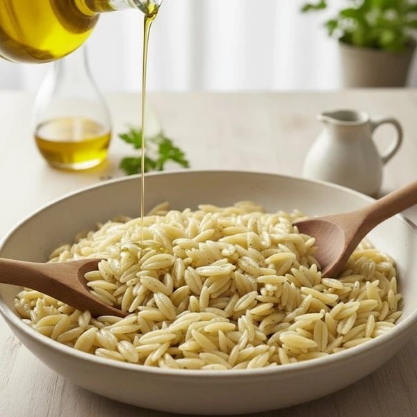 - Lightly drizzle the orzo with olive oil and toss gently so the individual grains remain separate and glossy, preventing sticking.