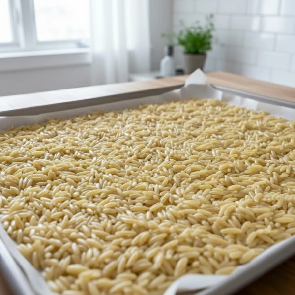 - Spread the orzo evenly on a baking sheet to cool completely, gently tossing once or twice to maintain individual grain separation and avoid clumps as it cools.