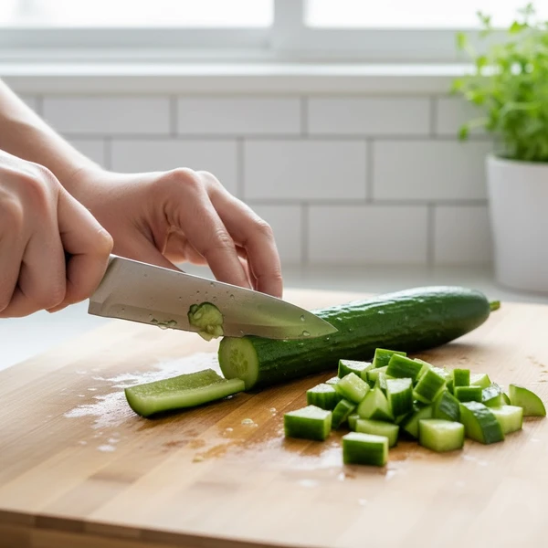 - Seed the English cucumber carefully to remove watery seeds, then dice into uniform small cubes to provide crisp texture without excess moisture.