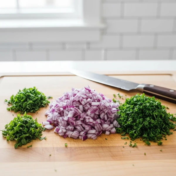 - Finely chop the red onion along with fresh parsley and optional fresh mint for bright, aromatic herbal notes that complement the salad’s creaminess and acidity.